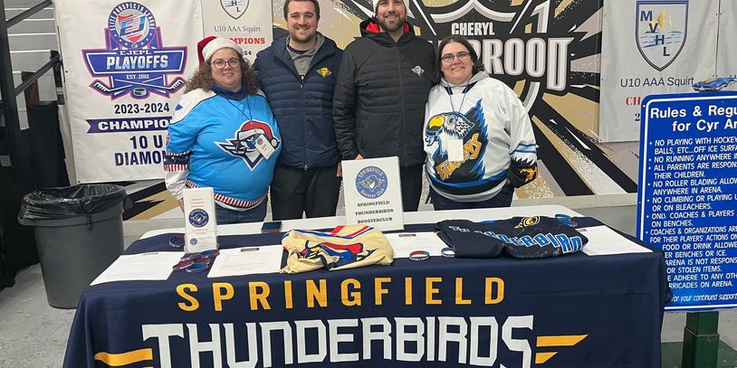 Behind us are (Left to right) Broomball Championship Jacket, Springfield Indians Game worn Jerseys (Blackhawks, Islanders & Whalers affiliations), Falcons Game worn Jersey & T-Birds Calder Cup Finals Game worn jersey, Springfield Indians Sweatshirt, 1990 Calder Cup T-shirt & 2 Booster Club Convention T-shirts.